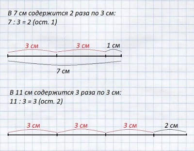 Ответ: 1) 21 : 7 = 3 3. Сделай чертёж и покажи, сколько раз по 3 см содержится в 7 см, в 11 см. Ответ: