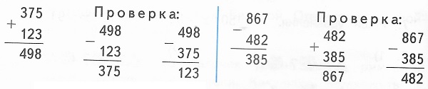 1) Объясни два способа проверки сложения и вычитания. Ответ: Пример 1 В первом случае для проверки из суммы вычитают второе слагаемое и получают первое, а во втором случае вычитают первое и получают второе. Пример 2 В первом случае для проверки к вычитаемому прибавляют разность и получают уменьшаемое, а во втором случае из уменьшаемого вычитают разность и получат вычитаемое. 2) Вычисли и сделай проверку.