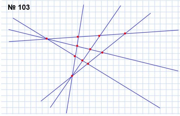 103. Проведите шесть прямых и отметьте на них 11 точек так, чтобы на каждой прямой было отмечено ровно четыре точки.